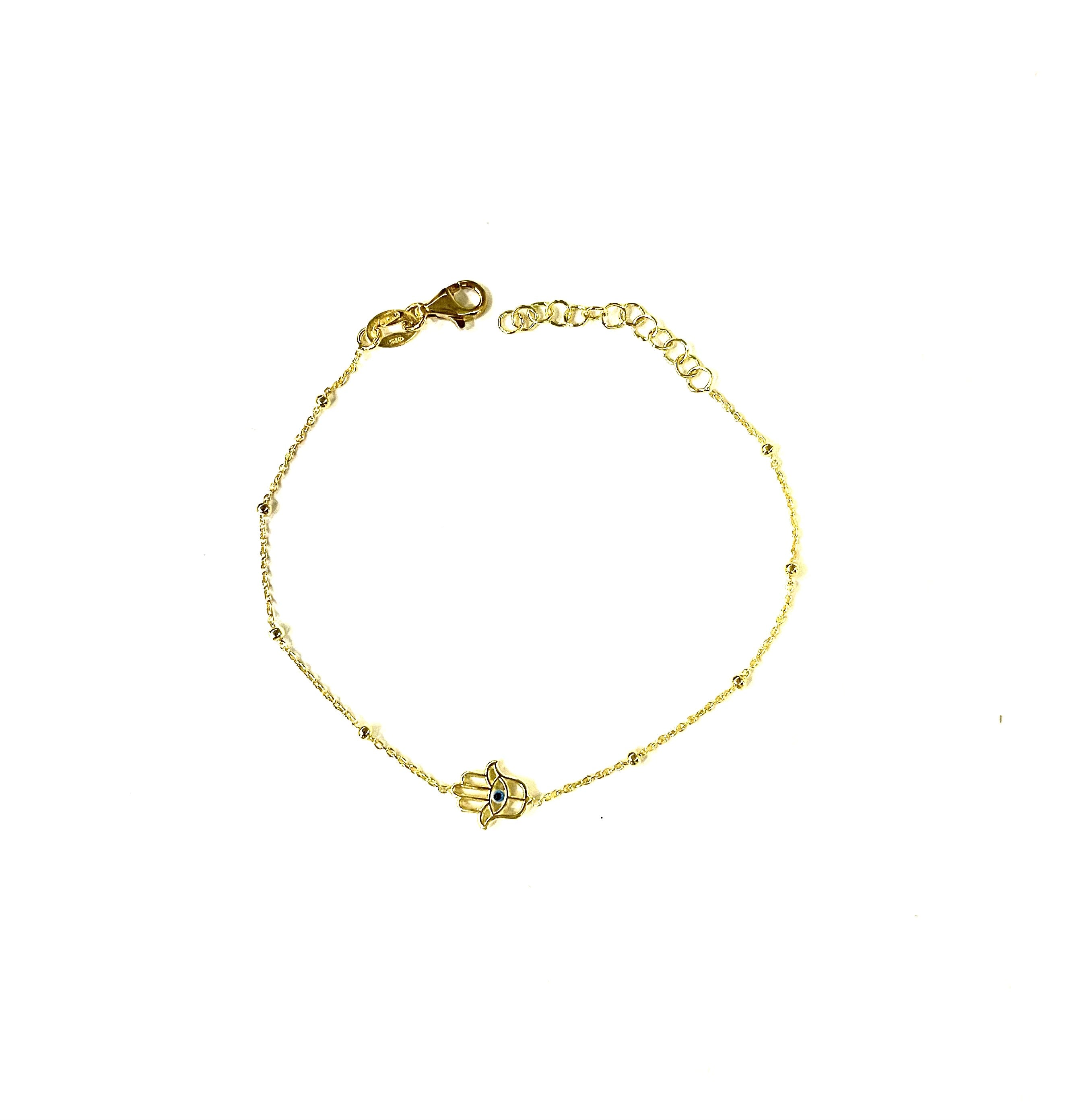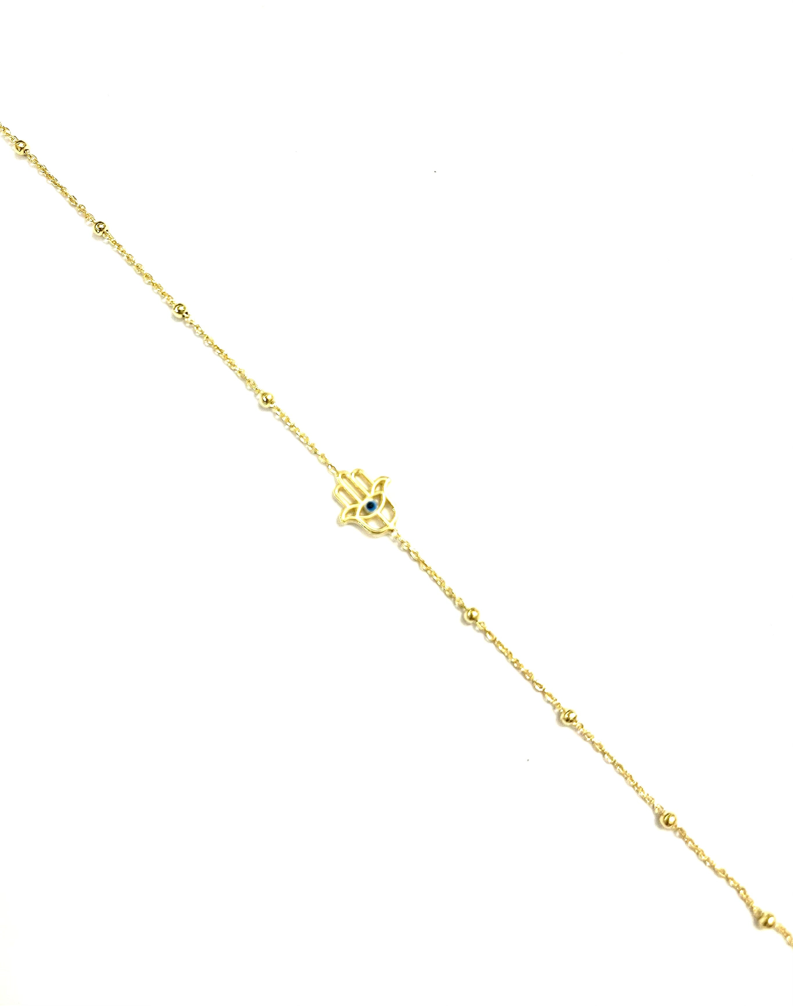Bracciale maglia pallina alternata con mano di Fatima centrale traforata e occhio smaltato azzurro e nero placcato oro giallo in argentoTIT925%