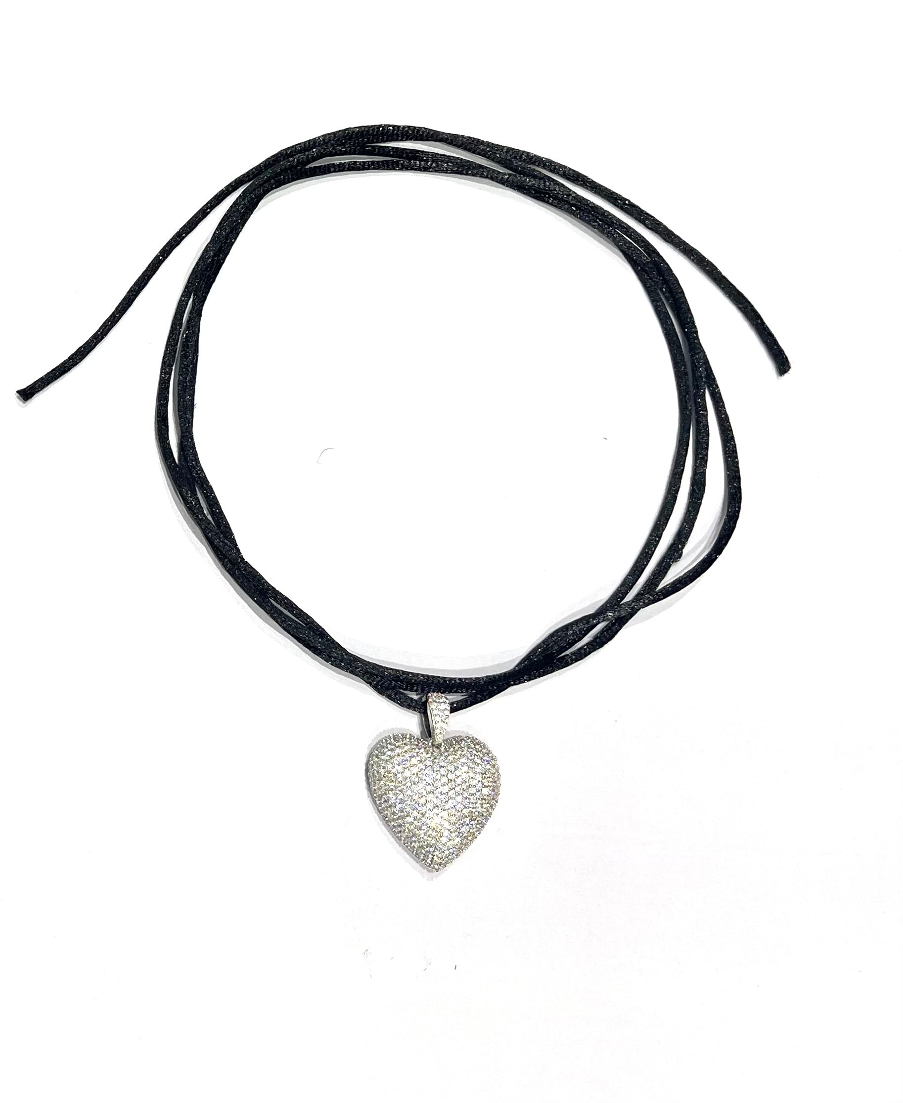 Choker in tessuto nero con ciondolo cuore full pavé di zirconi bianchi placcato oro bianco in argento TIT925%