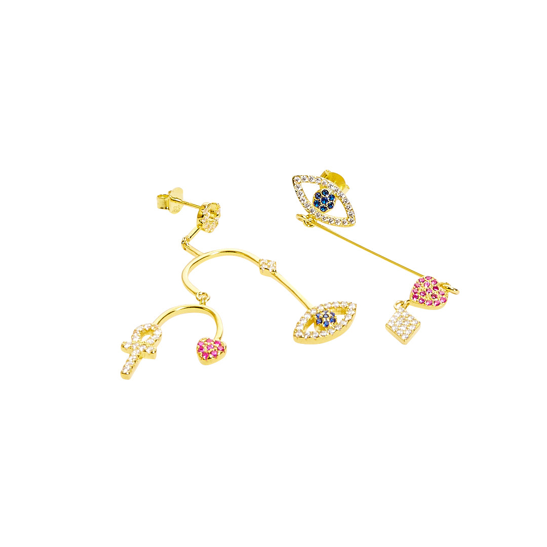 Orecchini pendenti disuguali semi-rigidi con soggetti Egitto zirconati in argento dorato TIT925%.