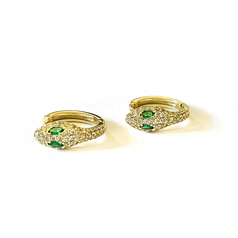 Orecchini scattino serpente in argento doratoTIT925% e zirconi bianchi e verdi.