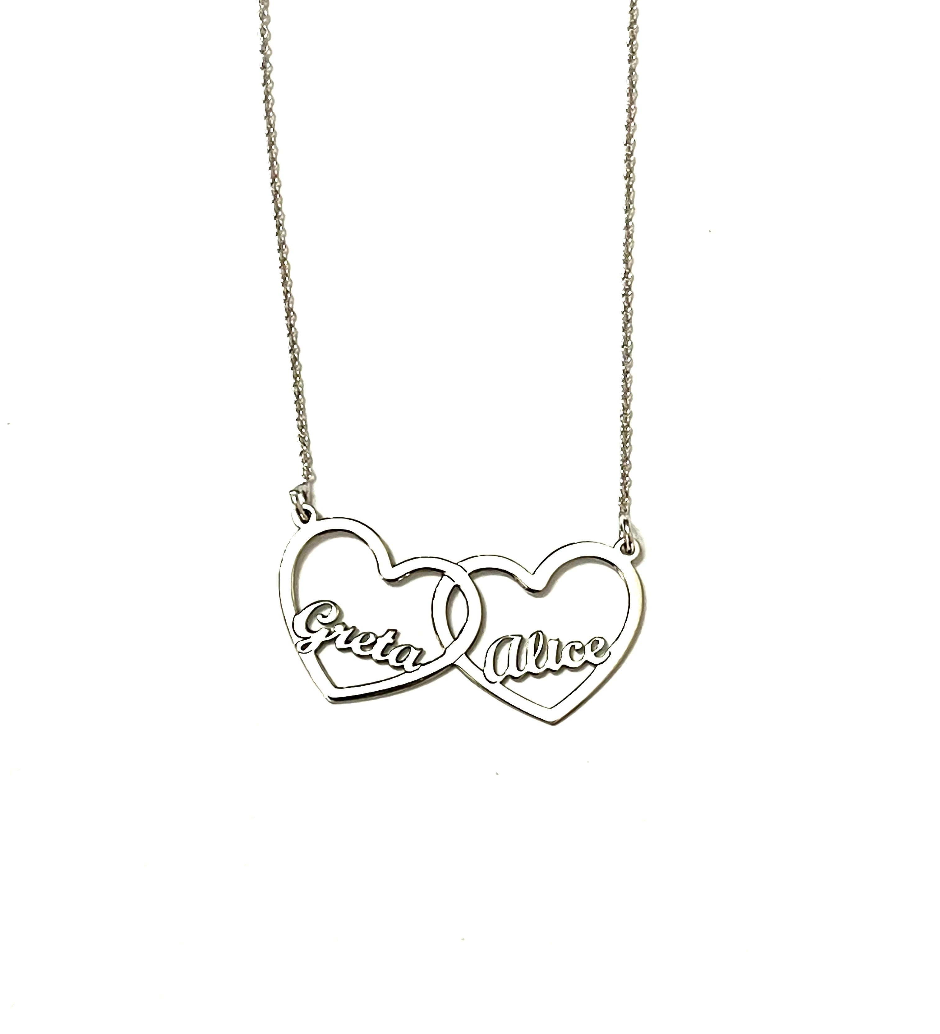 Collana personalizzata maglia rolo' con due cuori accoppiati e scritte centrali in argento rodiato TIT925%