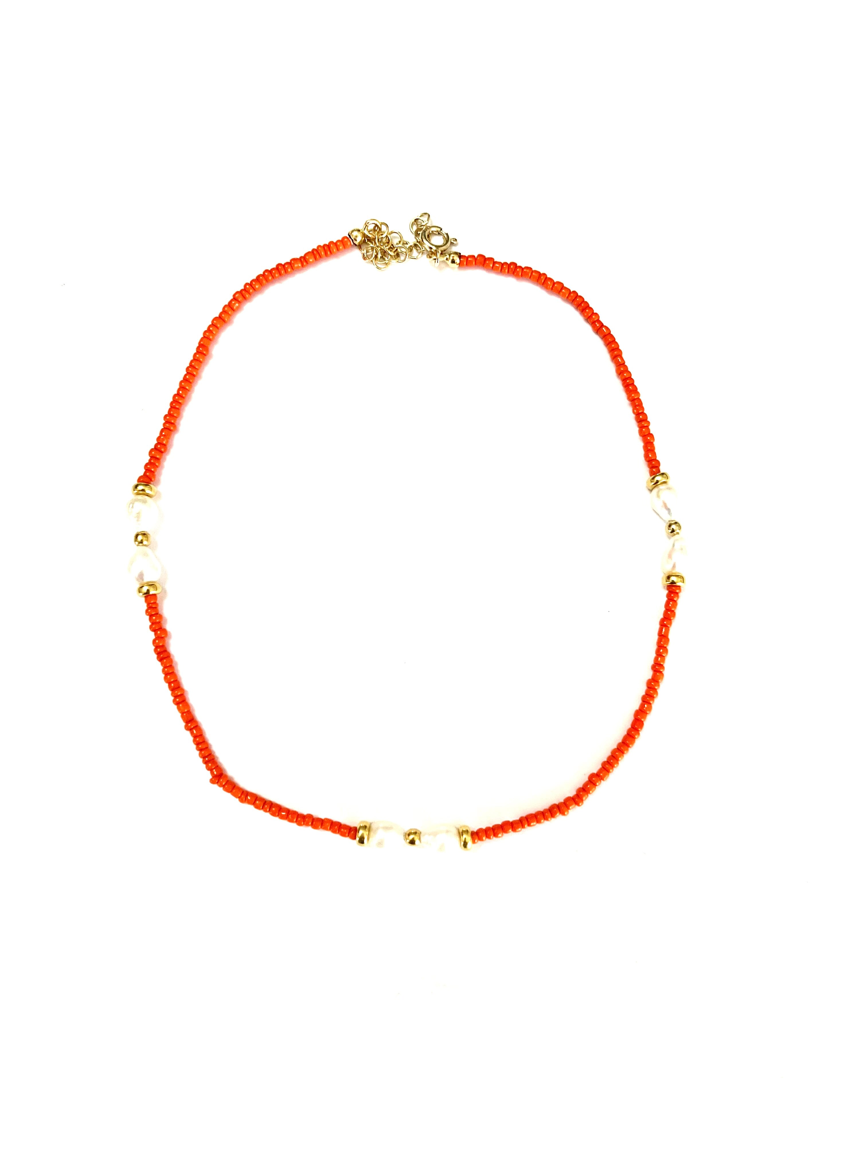 Collana con pasta di corallo arancio e perle barocche in argento dorato TIT925%
