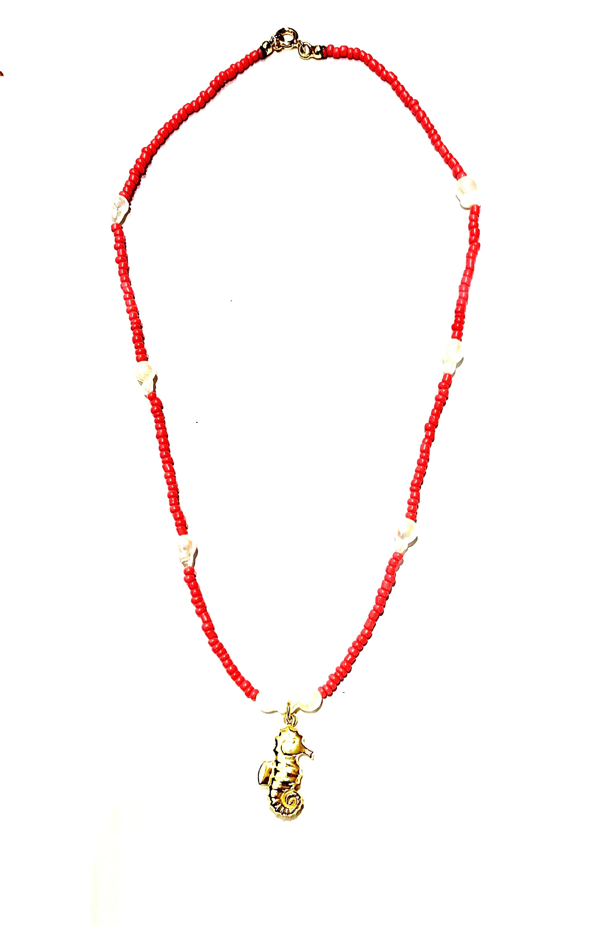Collana con corallini rosso corallo, perle di fiume e pendente in argento dorato TIT925%