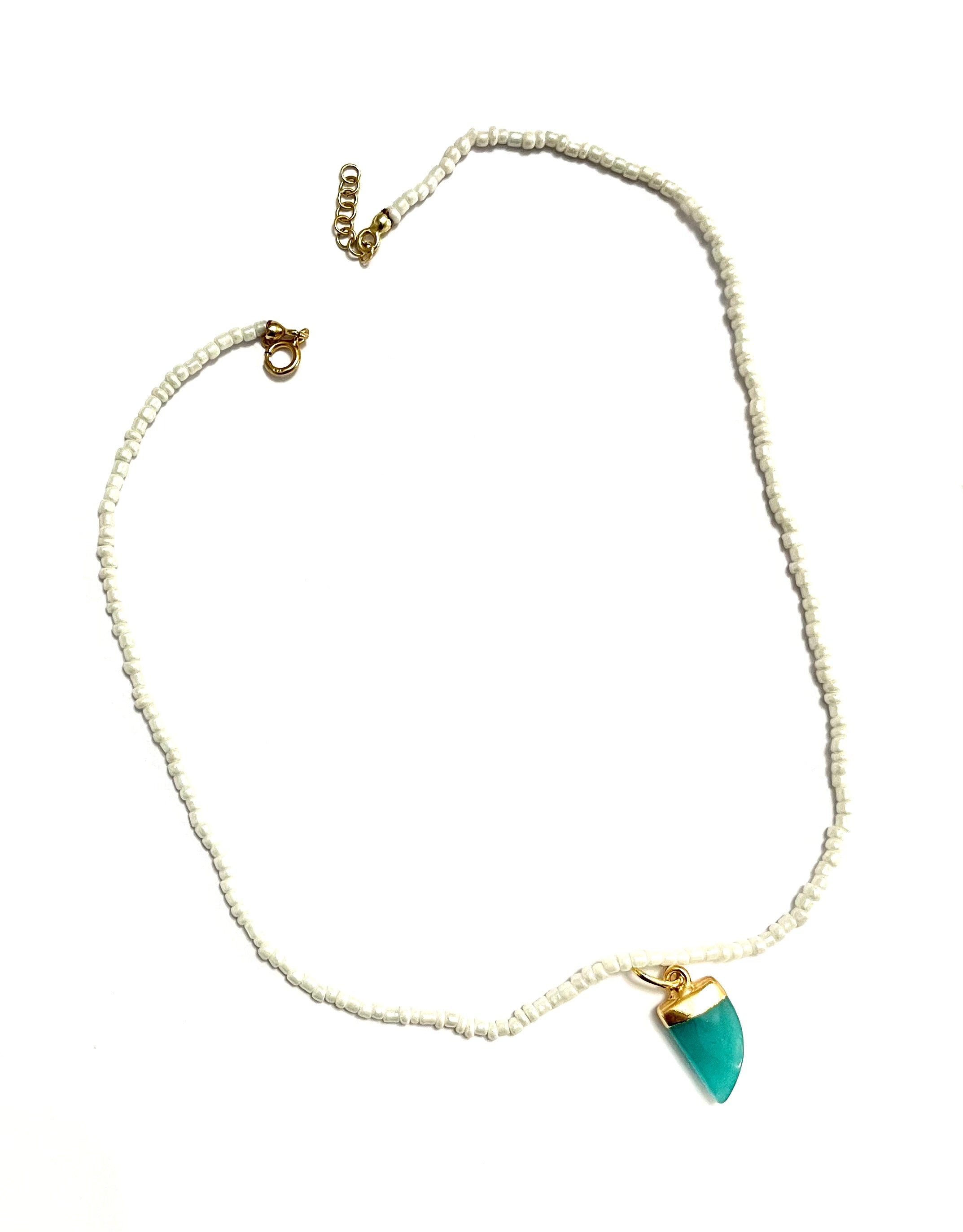 Collana in perline di colore bianco e ciondolo corno in pietra e pasta di turchese in argento dorato TIT925%