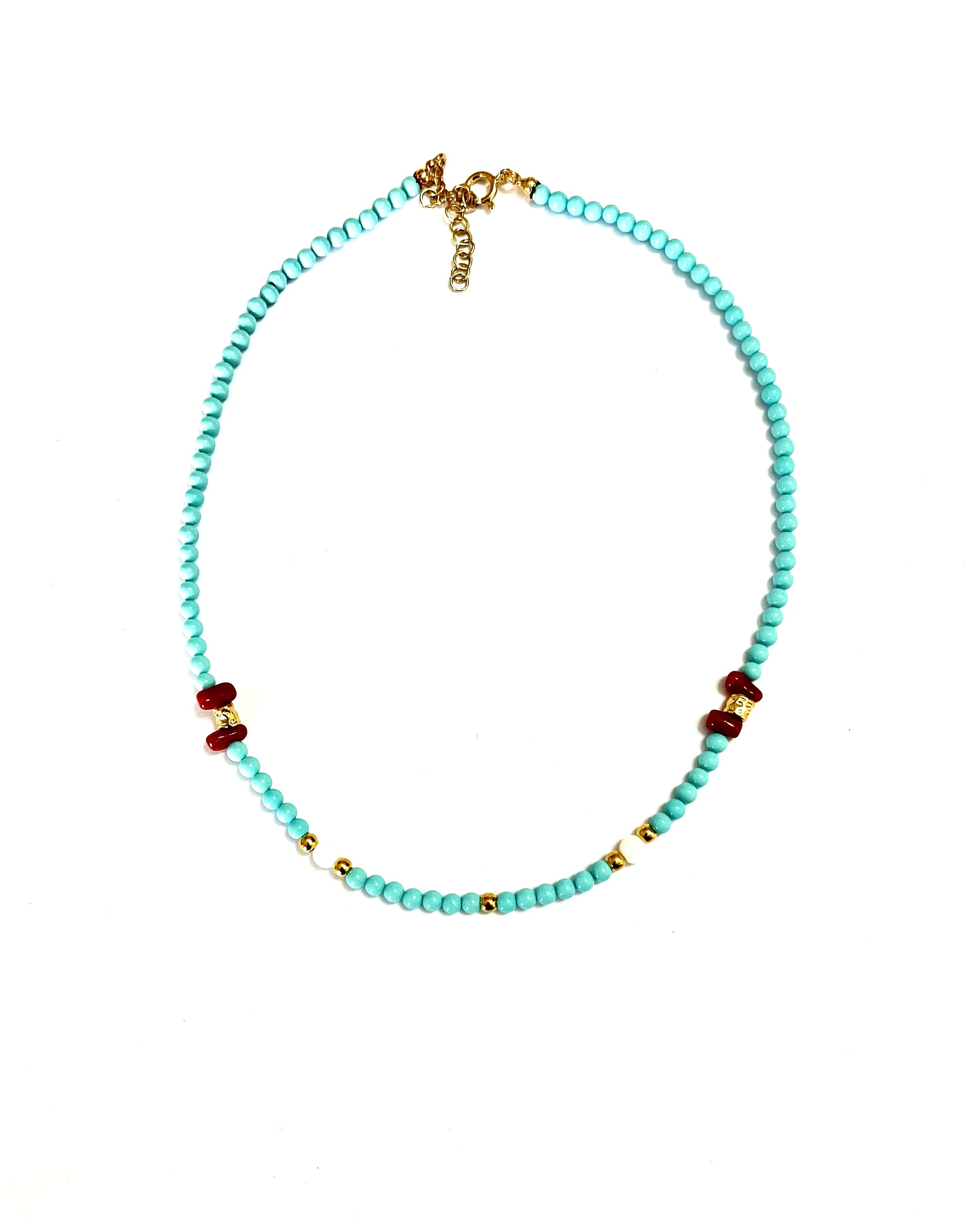 Collarino in pasta turchese, segmenti in pasta rossa e sfere lucide in argento dorato TIT925%