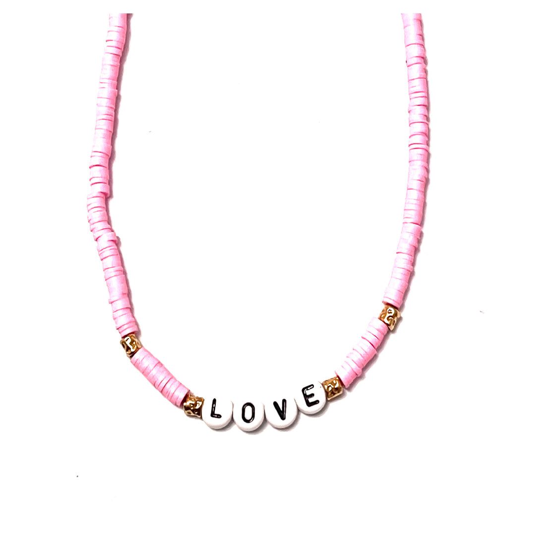 Pink polymer clay necklace with LOVE writing in golden silver TIT925%